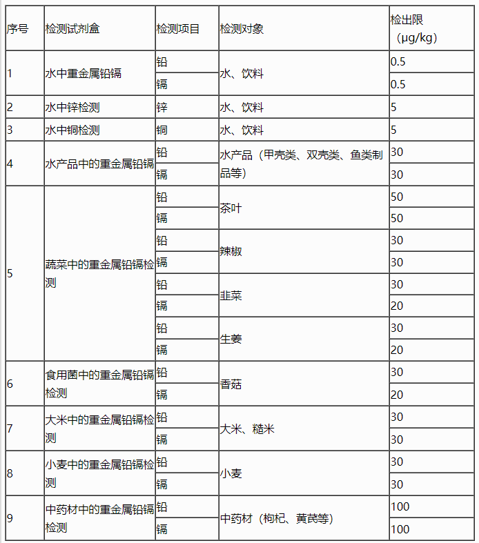 | 檢測(cè)試劑盒 | 檢測(cè)項(xiàng)目 | 檢測(cè)對(duì)象 | 檢出限(μg/kg) |